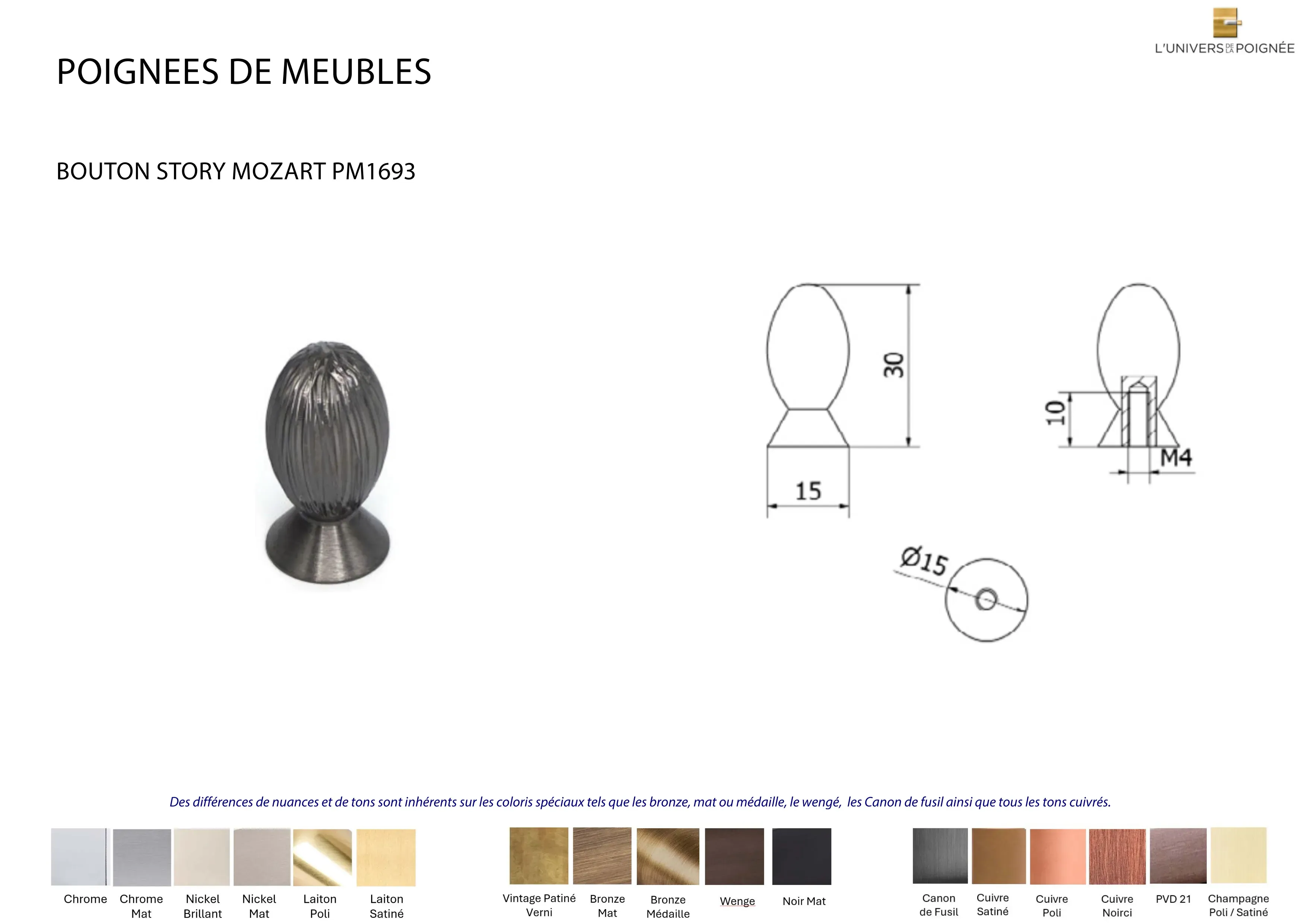 Parce que chaque intérieur mérite une finition sur mesure, le bouton est disponible en plus de 15 coloris différents, parmi lesquels : Laiton satiné ; Laiton poli ; Chrome mat ; Chrome brillant ; Nickel mat ; Nickel brillant ; Bronze mat ; Bronze médaille ; Bronze vintage ; Wengé ; Blanc ; Noir mat ; Canon de fusil ; Cuivre satiné ; Cuivre brillant ; Cuivre noirci ; Champagne mat ; Champagne brillant