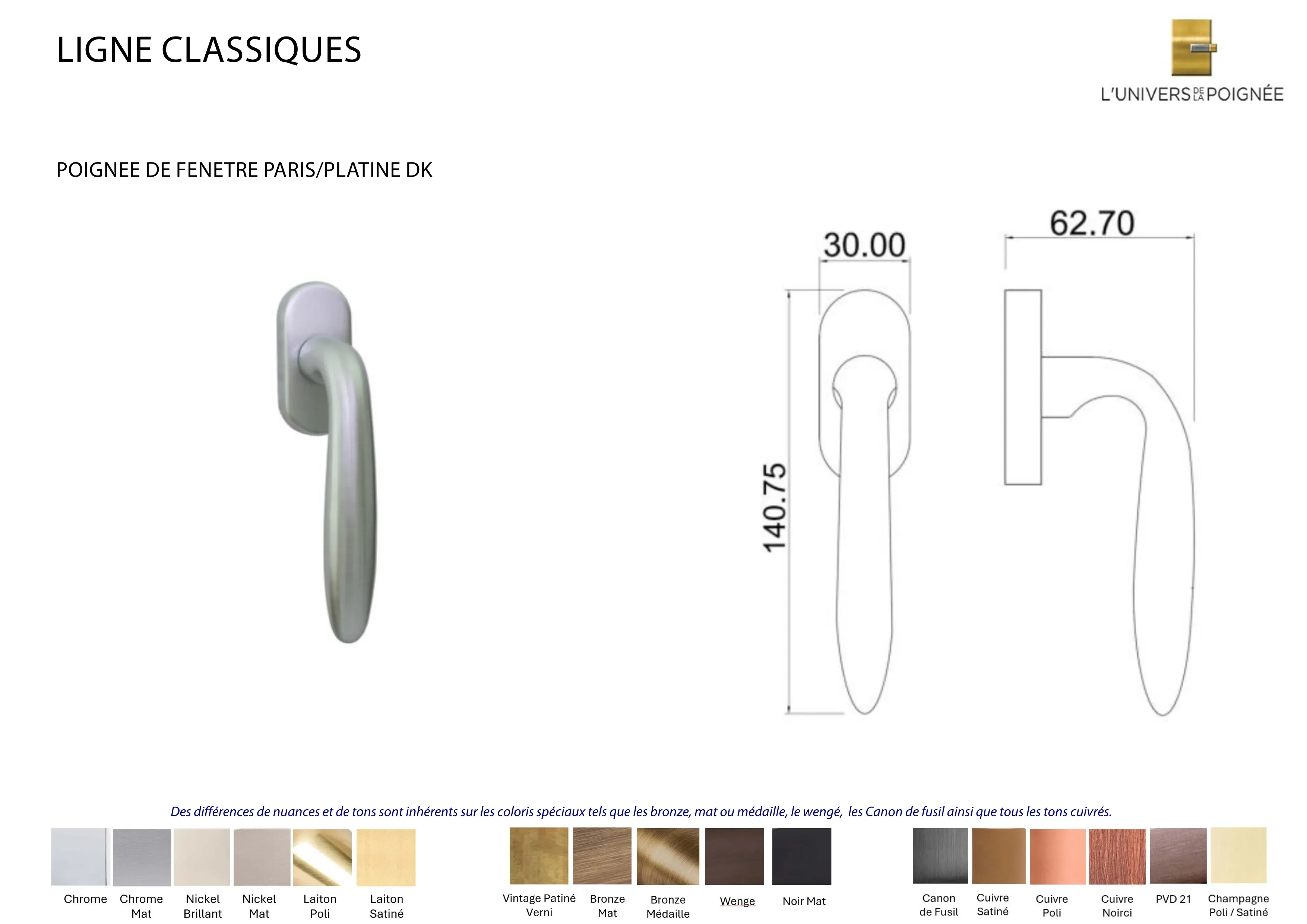 Parce que chaque intérieur mérite une finition sur mesure, la poignée de fenêtre Paris est disponible en plus de 15 coloris différents, parmi lesquels : Laiton satiné ; Laiton poli ; Chrome mat ; Chrome brillant ; Nickel mat ; Nickel brillant ; Bronze mat ; Bronze médaille ; Bronze vintage ; Wengé ; Blanc ; Noir mat ; Canon de fusil ; Cuivre satiné ; Cuivre brillant ; Cuivre noirci ; Champagne mat ; Champagne brillant